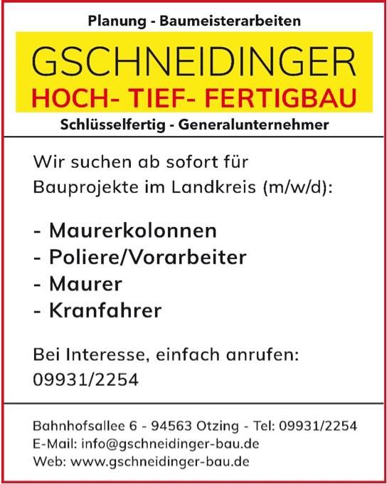 Mail: Diese E-Mail-Adresse ist vor Spambots geschützt! Zur Anzeige muss JavaScript eingeschaltet sein!Web: www.gschneidinger-bau.de